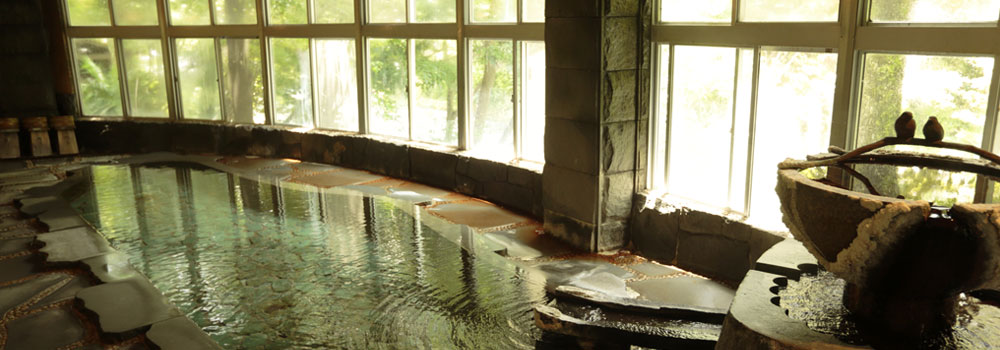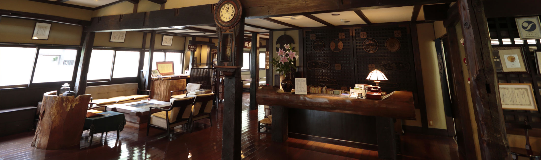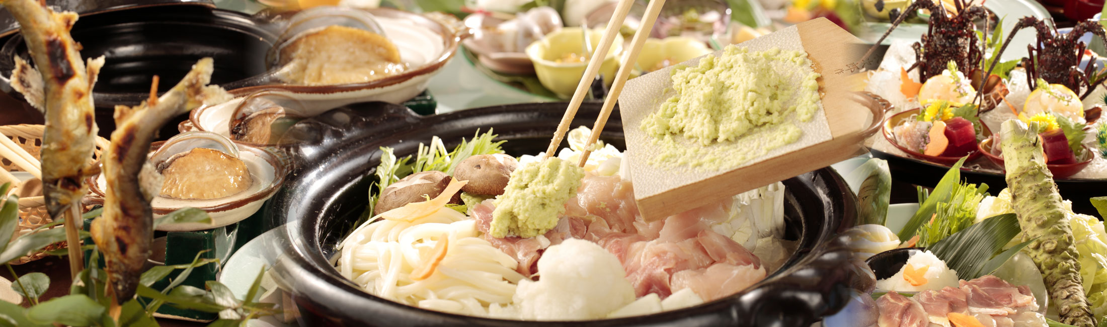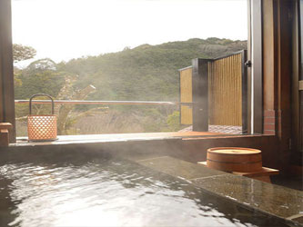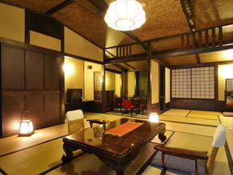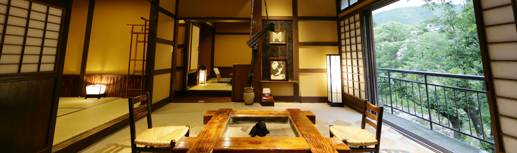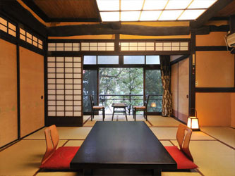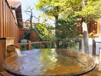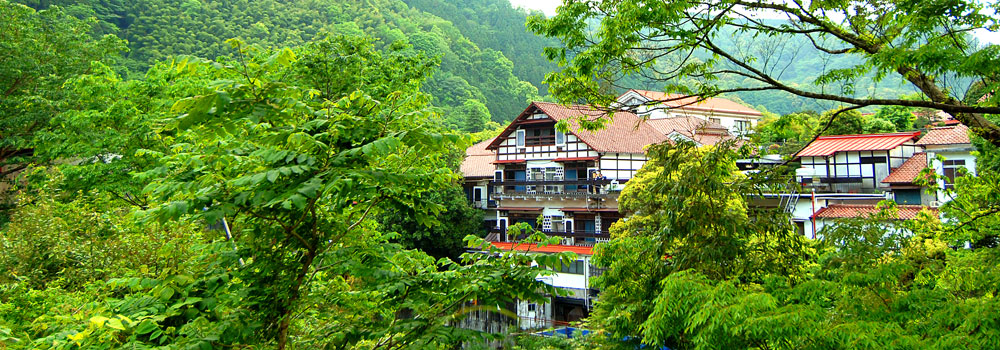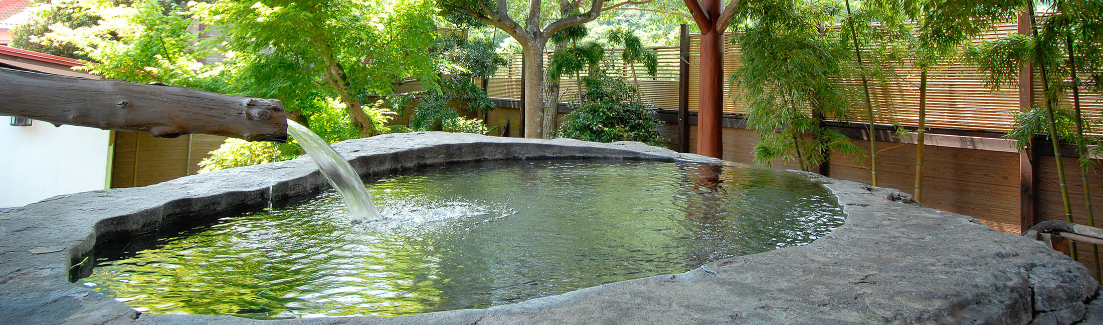 The Izu Peninsula is in eastern Shizuoka Prefecture, about 100 kilometers from Tokyo, jutting out into the sea from the southern foothills of Mt. Fuji.Izu is predominantly mountainous, and at its center flows the Kano River. Following the Kano River upstream, you will come to a beautiful gorge at the foot of Mt. Amagi. This is where you will find the Yugashima hot springs. Shirakabeso is about 25 minutes by bus from Shuzenji Station on the Izu-Hakone Railway Line. Get off at “Yugashima Onsen Iriguchi Teiryujo” bus stop. Next to the bus stop is a narrow descending stairway. Follow these steps and you will find the Yumichi, a narrow stroll path through natural surroundings linking public bathing areas and the Yugashima hot spring inns. Here, let the weariness of the journey slip away as you immerse yourself in the light filtering through the branches of plentiful forests and in the blissful waters from Mt. Amagi. As you follow the Yumichi down the Kano River, enjoy the natural beauty of your surroundings, and eventually you will arrive at Shirakabeso. You will recognize it from its white wall with the lattice pattern and its red-tiled roof.