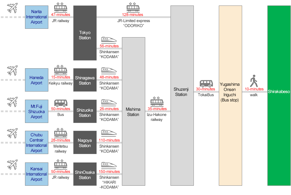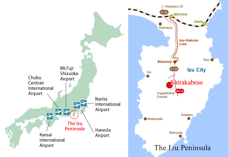 Access Izu Amagi Yugashima Onsen Shirakabeso 1594 Yugashima, Izu City, Shizuoka 410-3206, Japan Phone +81-558-85-0100 Fax +81-558-85-0726 email yado@shirakabeso.jp. For guests travelling by air, train, or bus For guests traveling by car google Map